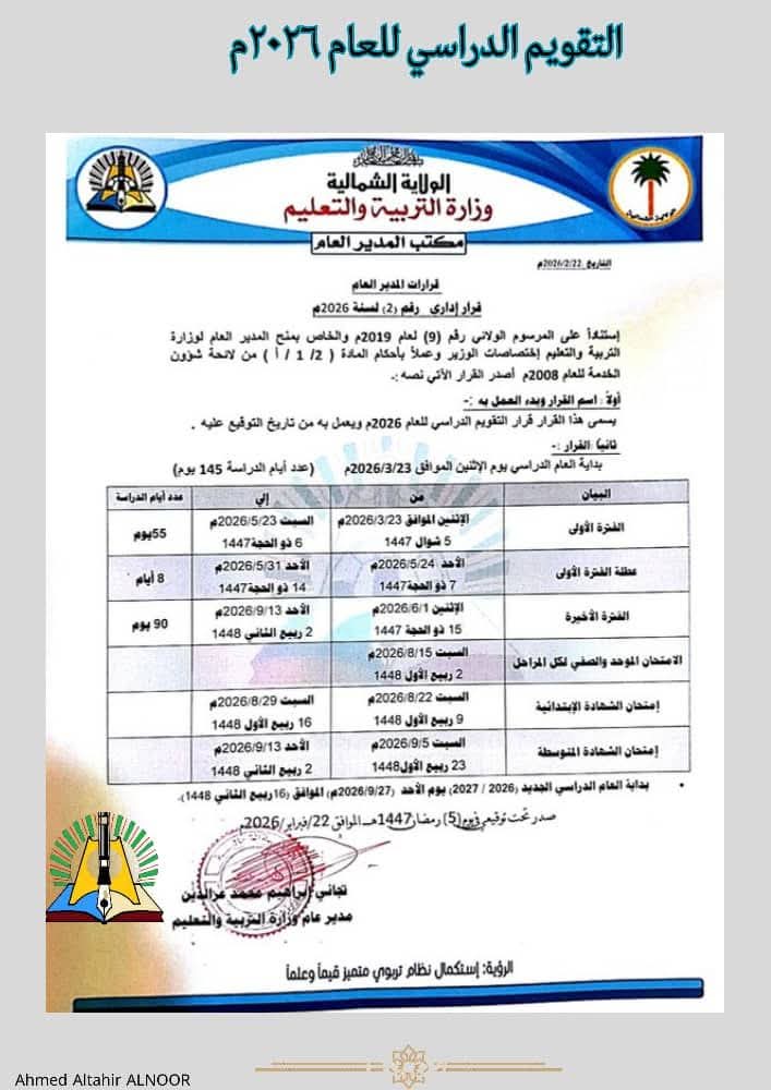 أخبار التربية والتعليم بالولاية الشمالية تقرر بدء الدراسة في الثالث والعشرون من مارس المقبل الشمالية :اخبار السودان أصدرت وزارة التربية والتعليم بالولاية الشمالية قرار المدير العام رقم (2) لسنة 2026م بشأن التقويم الدراسي للعام…