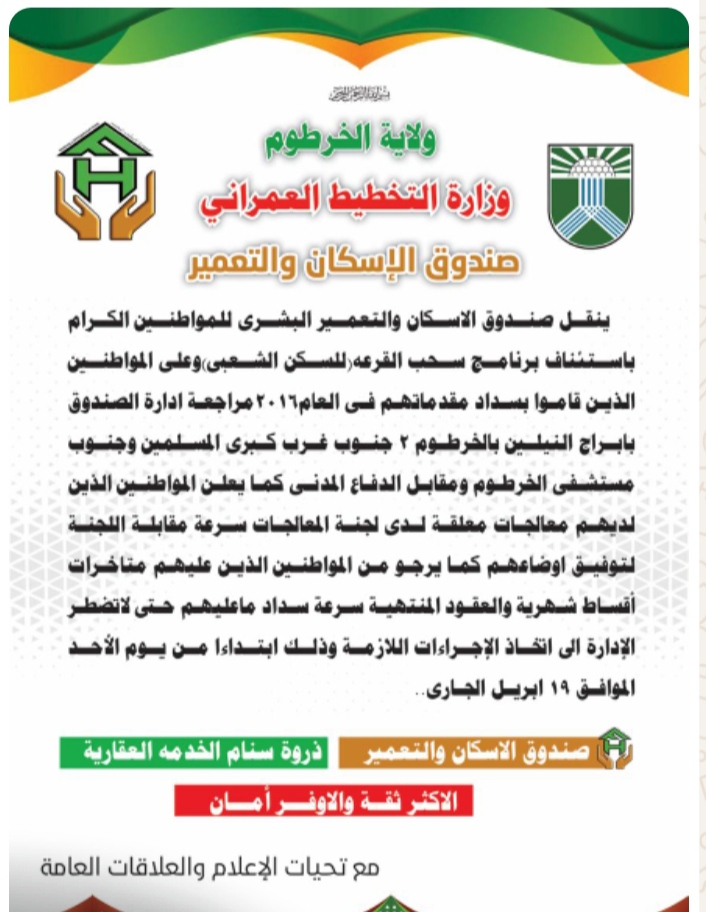 إقتصاد وأعمال صندوق الإسكان والتعمير يعلن استئناف سحب القرعة للسكن الشعبي بالخرطوم الخرطوم :اخبار السودان أعلن صندوق الاسكان والتعمير عن استئناف برنامج سحب القرعة (للسكن الشعبى) وعلى المواطنين الذين قاموا بسداد مقدماتهم…