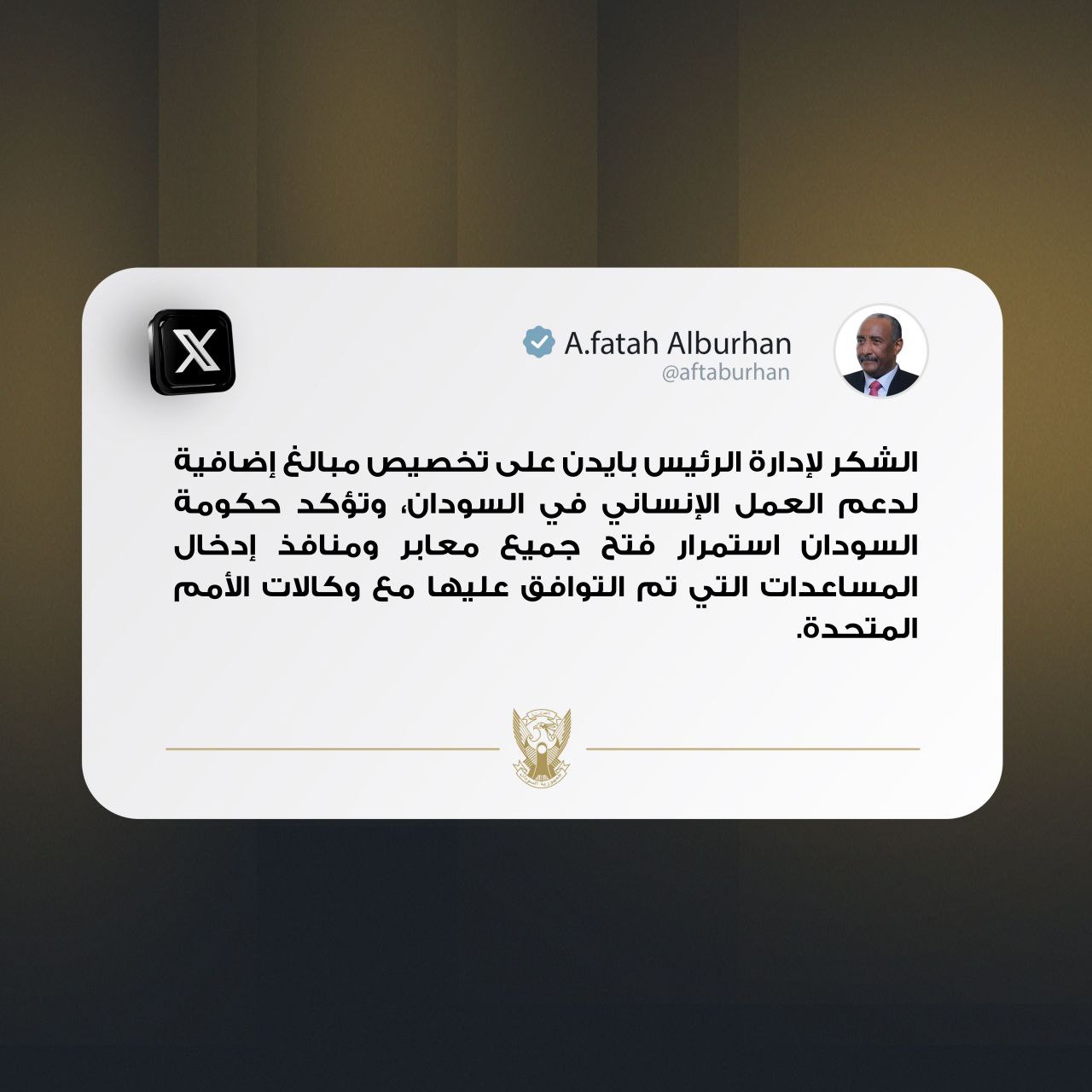شكر رئيس مجلس السيادة عبد الفتاح البرهان إدارة الرئيس بايدن على تخصيص مبالغ إضافية لدعم العمل الإنساني في السودان، وقال فى تغريدة له على منصة أكس تؤكد حكومة السودان استمرار فتح جميع معابر ومنافذ إدخال المساعدات التي تم التوافق عليها مع وكالات الأمم المتحدة.