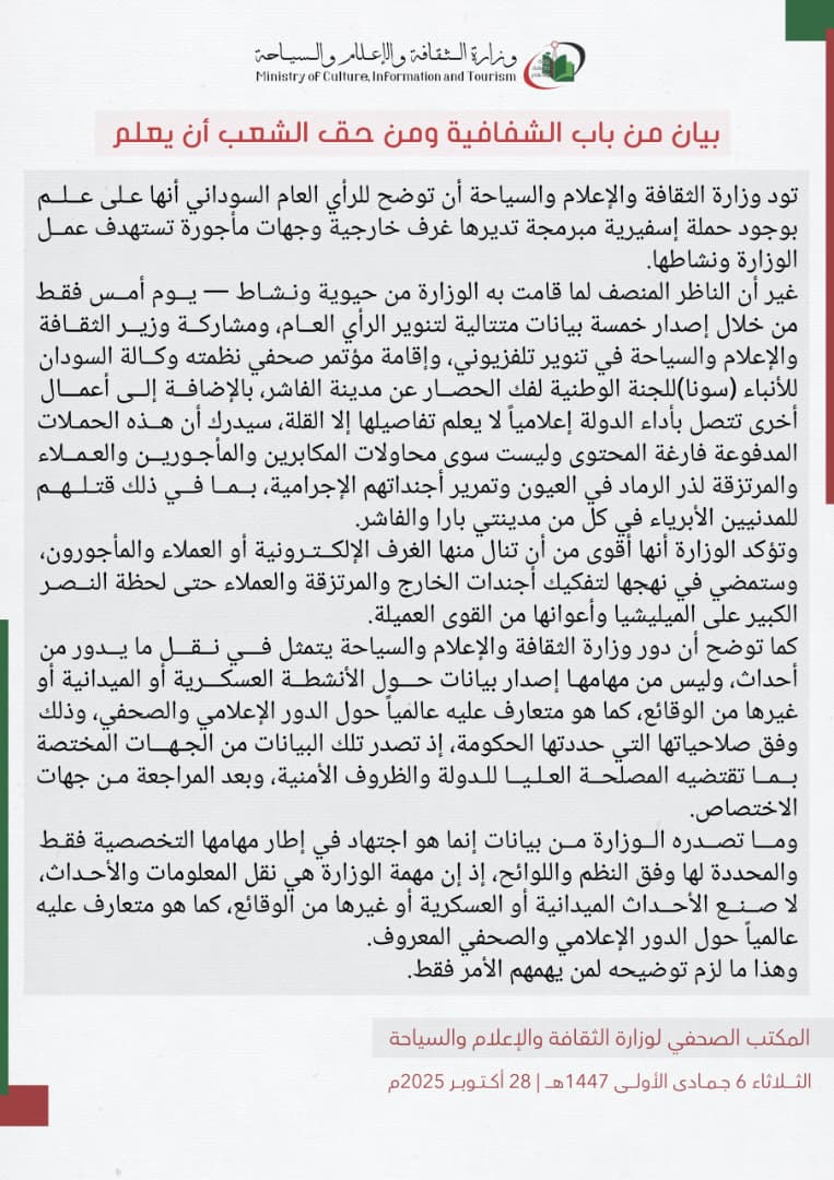 غير أن الناظر المنصف لما قامت به الوزارة من حيوية ونشاط — يوم أمس فقط — من خلال إصدار خمسة بيانات متتالية لتنوير الرأي العام، ومشاركة وزير الثقافة والإعلام والسياحة في تنوير تلفزيوني، وإقامة مؤتمر صحفي نظمته وكالة السودان للأنباء (سونا)للجنة الوطنية لفك الحصار عن مدينة الفاشر، بالإضافة إلى أعمال أخرى تتصل بأداء الدولة إعلامياً لا يعلم تفاصيلها إلا القلة، سيدرك أن هذه الحملات المدفوعة فارغة المحتوى وليست سوى محاولات المكابرين والمأجورين والعملاء والمرتزقة لذر الرماد في العيون وتمرير أجنداتهم الإجرامية، بما في ذلك قتلهم للمدنيين الأبرياء في كل من مدينتي بارا والفاشر.