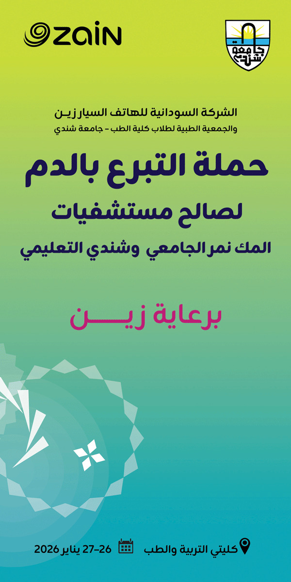 في إطار التزامها المستمر بمسؤوليتها المجتمعية ودعم القطاع الصحي، أطلقت الشركة السودانية للهاتف السيّار “زين” حملة للتبرع بالدم، بالشراكة مع الجمعية الطبية لطلاب كلية الطب بجامعة شندي. وتُقام الحملة يومَي الإثنين والثلاثاء الموافقَين 26 و27 يناير 2026، في مدينة شندي بولاية نهر النيل، وذلك لصالح مستشفى المك نمر التعليمي ومستشفى شندي الجامعي.