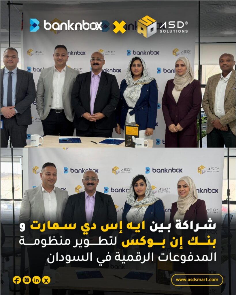 في خطوة تدعم التحول الرقمي في السودان، وقّعت شركة ايه اس دي سمارت ASD Smart وشركة بنك إن بوكس BanknBox اتفاقية تعاون إستراتيجية لتطوير منظومة التحويل اللحظي وتعزيز الشمول المالي في السودان وبناء منصة دفع موحدة للمصارف السودانية.