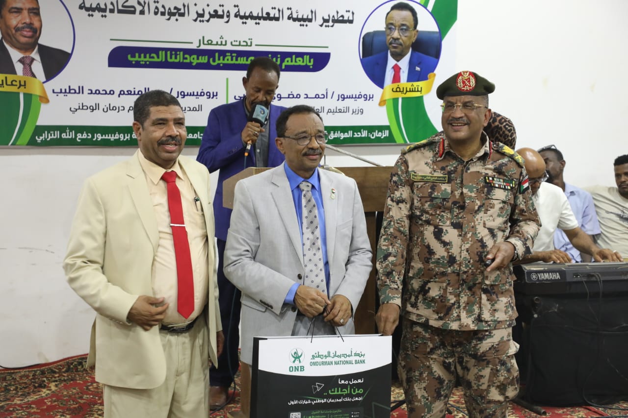 جاء ذلك لدى مخاطبته ظهر اليوم بقاعة بروفيسور دفع الله الترابي بجامعة الخرطوم حفل تدشين مساهمة بنك أم درمان الوطني بدعم الجامعات بمعينات تدريسية، تحت شعار بالعلم نبني مستقبل سوداننا الحبيب، بحضور اللواء ركن محمد الفاتح مستشار القائد العام للقوات المسلحة ورئيس مجلس إدارة بنك امدرمان الوطني، وبروفيسور عبد المنعم محمد الطيب مدير البنك والأستاذ علي الشيخ السماني وكيل وزارة التعليم العالي وعدد كبير من مديري الجامعات، وممثل جهاز المخابرات العامة، وممثل مدير شرطة تأمين الجامعات، وعدد من القيادات الأكاديمية والتنفيذية.