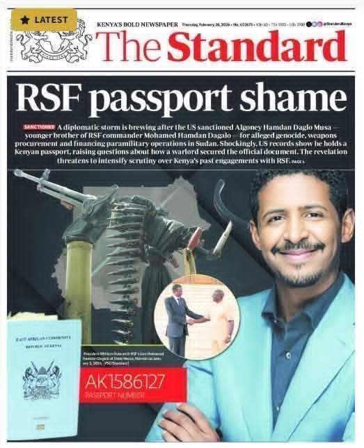 أفردت صحيفة “ذا ستاندرد” (The Standard) الكينية العريقة غلاف صفحتها الأولى كاملاً لصورة القوني حمدان، شقيق قائد التمرد. وجاء ذلك تحت عنوان صارخ يصف الواقعة بـ “فضيحة جواز سفر قوات الدعم السريع”، في تقرير أعده الصحفي الاستقصائي فرانسيس أنتومو.