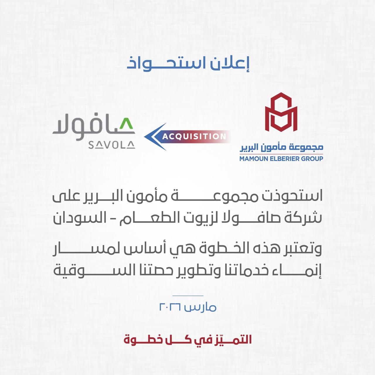 أعلنت مجموعة مأمون البرير اليوم السبت إتمام صفقة الاستحواذ الكامل على شركة صافولا لزيوت الطعام السودان، التابعة لمجموعة صافولا السعودية، عبر إحدى شركاتها الصناعية،وبموجب الاتفاق تنتقل ملكية الشركة بنسبة 100% إلى مجموعة مأمون البرير، لتشمل الصفقة جميع الأصول والاستثمارات داخل السودان، بما في ذلك المصانع والمنشآت الصناعية والاستثمارات الزراعية وسلاسل الإمداد والتوزيع، إضافة إلى العلامات التجارية وحقوق الملكية الفكرية المرتبطة بالشركة داخل البلاد.