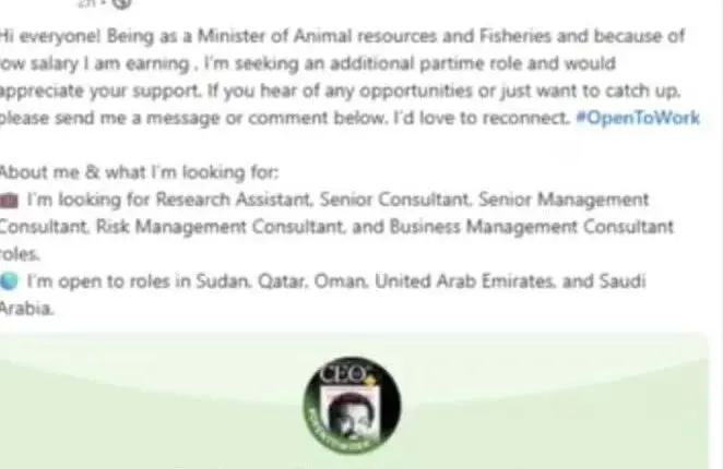 اثار وزير الثروة الحيوانية الدكتور أحمد التجاني المنصوري، ضجة واسعة وذلك عقب بحثه عن وظيفة إضافية لزيادة دخله عبر موقع “لينكد إن”.