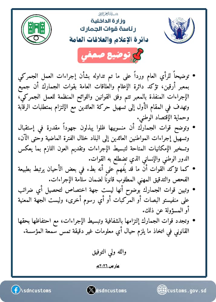 أصدرت قوات الجمارك السودانية توضيحاً صحفياً بشأن ما تم تداوله حول إجراءات العمل في معبر أرقين، مؤكدة أن جميع التدابير المتبعة تتم وفق القوانين واللوائح المنظمة، وتهدف بالدرجة الأولى إلى تسهيل حركة العائدين إلى البلاد مع الحفاظ على متطلبات الرقابة وحماية الاقتصاد الوطني.