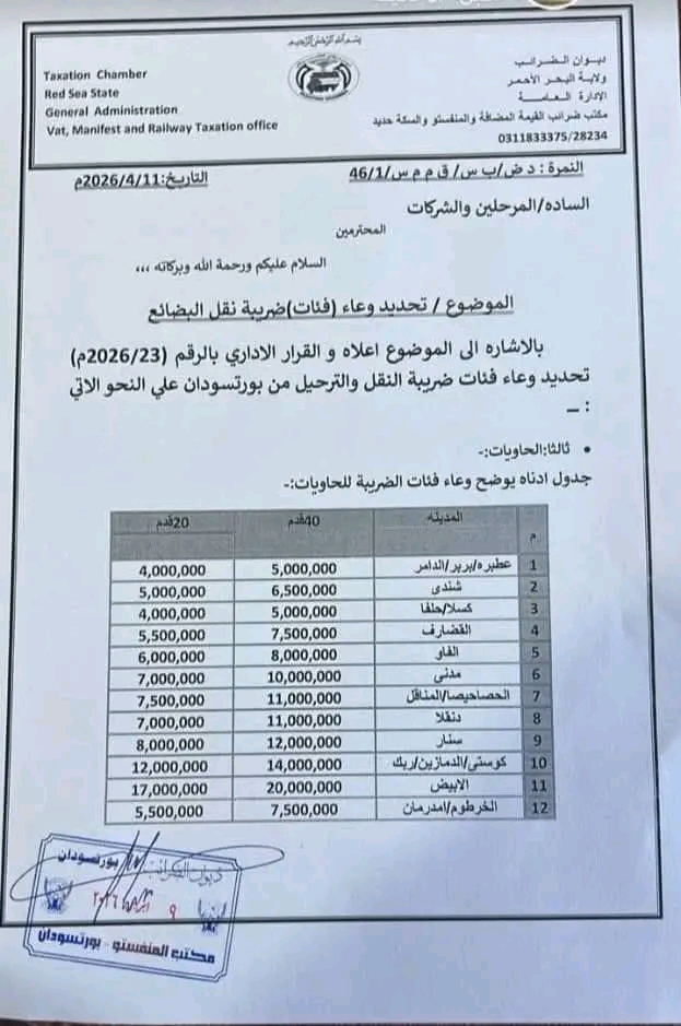 أصدرت الإدارة العامة لضرائب ولاية البحر الأحمر، عبر مكتب ضرائب القيمة المضافة والمنشآت والميناء والسكة حديد، قراراً إدارياً قضى بتحديد وعاء فئات ضريبة نقل وترحيل البضائع من بورتسودان، وذلك وفقاً للقرار رقم (23) لسنة 2026م.