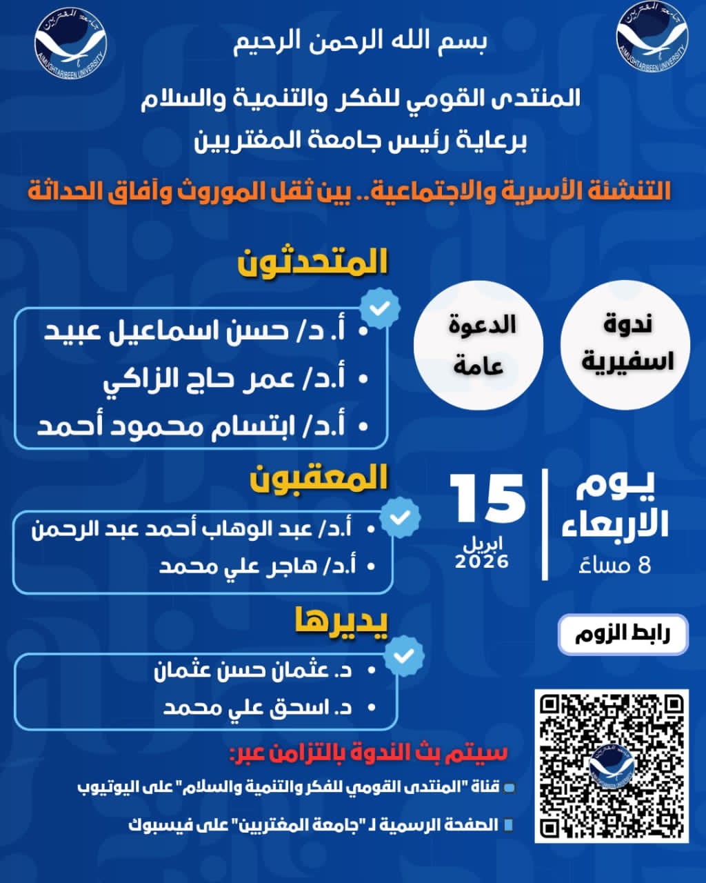 ومن المقرر أن تُعقد الندوة مساء اليوم الأربعاء 15 أبريل 2026م، في تمام الساعة الثامنة مساءً بتوقيت السودان، عبر منصة (زووم)، مع إتاحة البث المباشر عبر قناة المنتدى القومي للفكر والتنمية والسلام على يوتيوب، والصفحة الرسمية لجامعة المغتربين على فيسبوك.